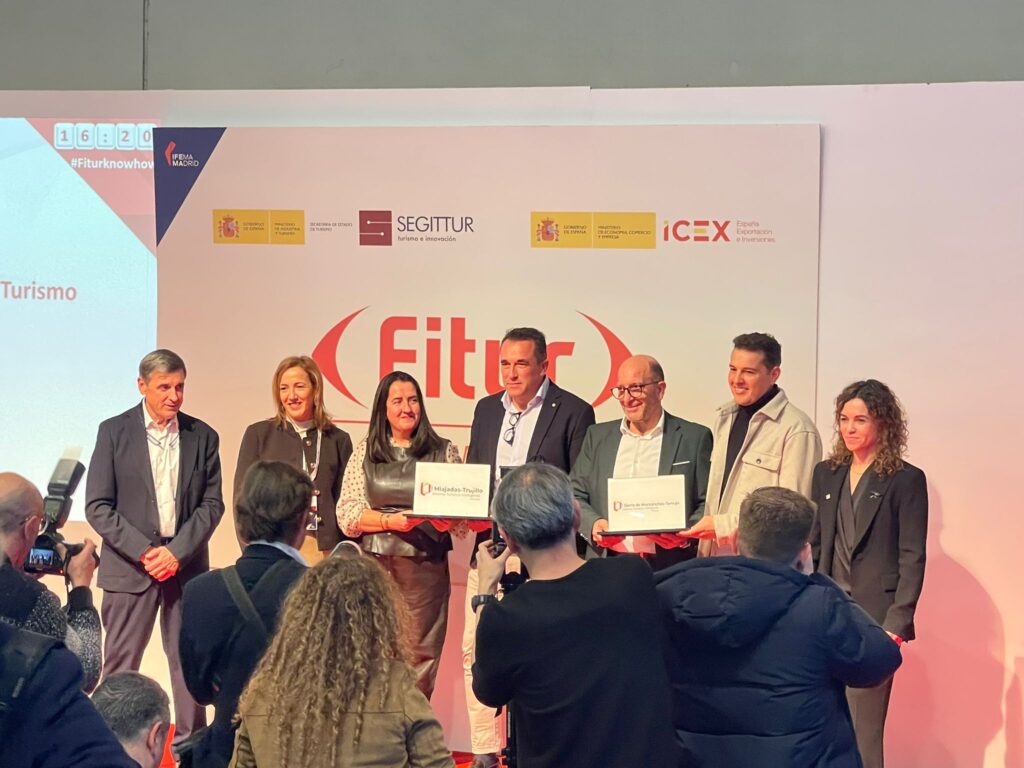 La comarca Sierra de Montánchez representada por Francisco Giraldo presidente de ADISMONTA y Juan Bote. Presidente de la Mancomunidad Integral Sierra de Montánchez recogen de manos de la Secretaría General de Turismo el distintivo DTI. Entregado en Fitur Know-How reconoce el modelo de gestión turística basado en innovación, tecnología y sostenibilidad que se está desarrollando en nuestro territorio .